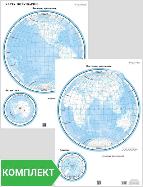 Настенные контурные карты. Комплект: карты полушарий (Восточное и Западное) с QR-кодами